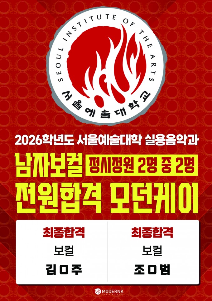 모던K 2026학년도 서울예술대학 실용음악과 남자보컬 정시정원 2명 중 2명 모두 전원 합격